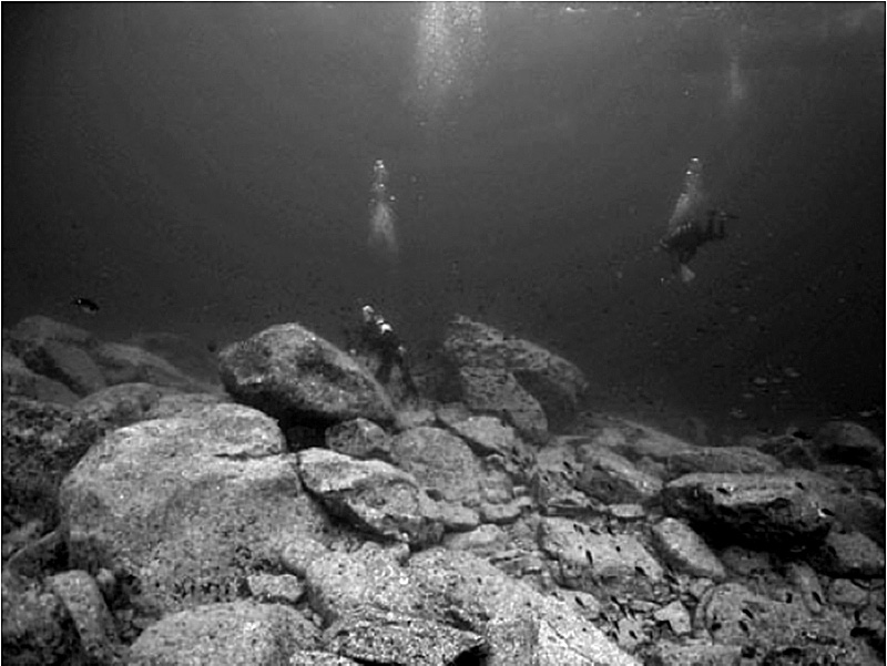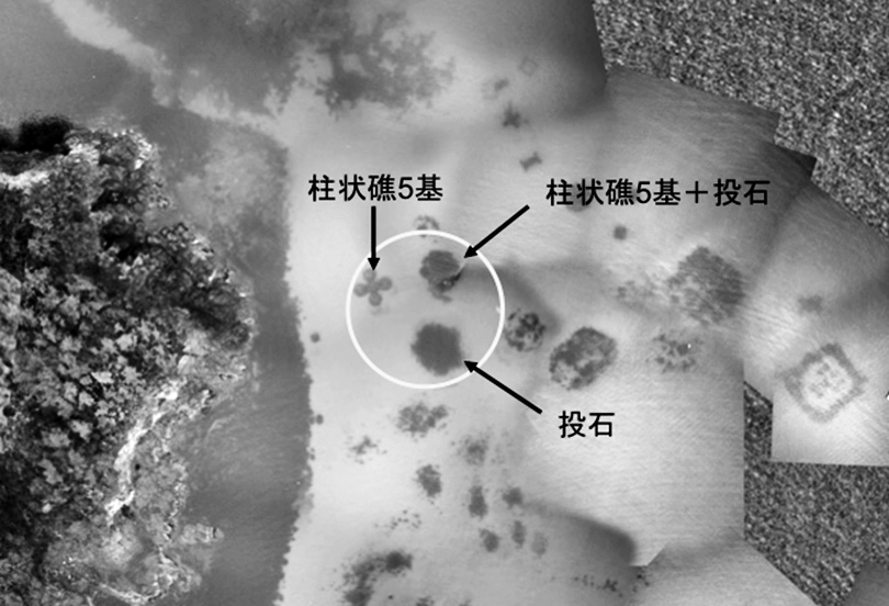 ②増殖礁の基盤形状による藻食魚のコントロール砂地海底上に魚礁群の中に、波浪による砂の移動や堆積、投石の反転を許容するように、割石を均一な多層にせず設置した。