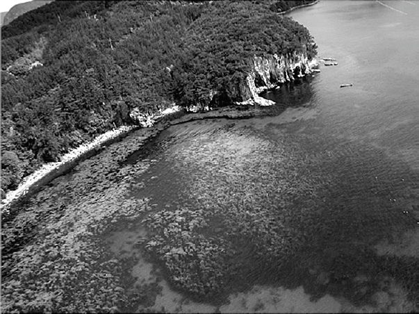 隠岐諸島では森林が海岸線付近まで分布し(図2)、林床の落ち葉が微生物などに分解された腐植土(腐葉土)が広く存在し、ここを通過する土壌水(地下水面より上の土に存在する水)により、腐植土の養分は海まで運ばれ、海岸近くの海底から広く湧出し、海草藻類による基礎生産を支えている。また、還元状態の腐植層で鉄イオンとフルボ酸が結びついたフルボ酸鉄も同時に供給される。この海岸近くからの海水の海底湧水の方が、表流水より、海草藻類が直接取り込める無機態の栄養塩の量が多いと考えられる。