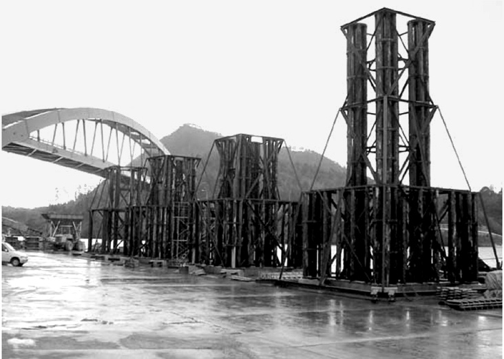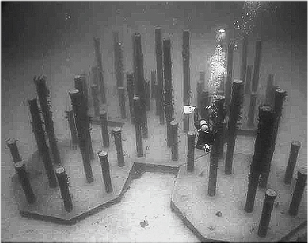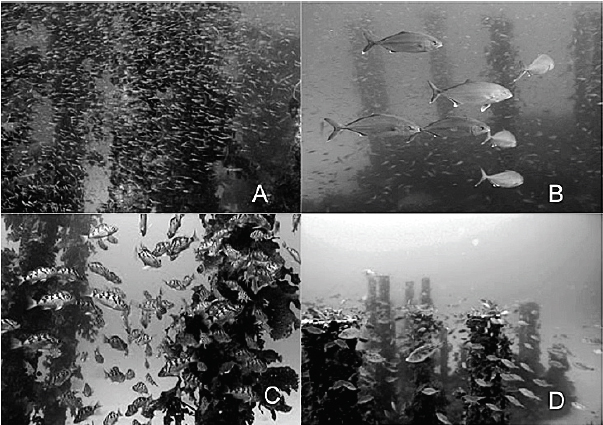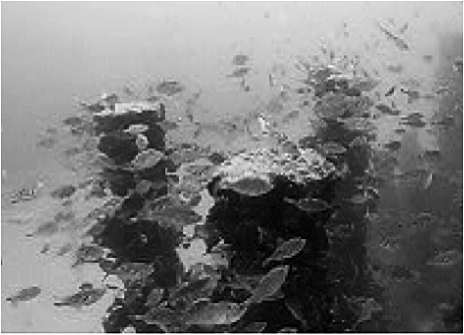 柱状礁(図5)は柱を立設した形状の人工礁で、数本の柱の間の空間が暗くなるために沿岸漁場、幼稚魚保護育成場の創出に高い効果を発揮している(図6、7)。また、内海や内湾の堆泥の多い海域であっても垂直な柱に泥が堆積しないため、クロメなどの遊走子の着底と生長が可能な藻礁として機能する。空m3あたりのコンクリートの量が通常の魚礁よりかなり少ないため、軟弱地盤であっても沈下・埋没しにくい。