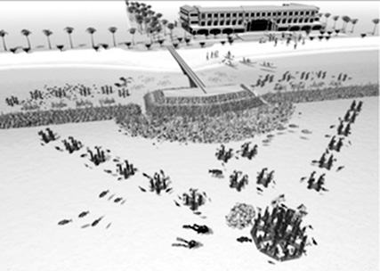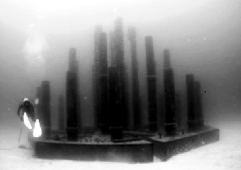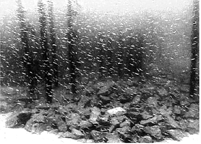 そこで、柱状礁の考え方を用いて、鉄筋棒を林立させた幼稚魚用魚礁(図10、11)を開発した。鉄筋棒が林立している魚礁では、やや暗い内部からは稚魚が周辺の捕食者を視認できるが、明るいところから移動してきた捕食者は魚礁内の幼稚魚を視認しにくい。また、大型の捕食者は小回りが利かないが、幼稚魚は細い柱の周囲を逃げることができる。このため、鉄筋棒による幼稚魚礁周辺には、全長5ミリ程度の幼稚魚の雲のような蝟集が確認されている(図11)。