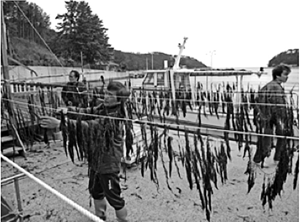(2)アカモクの商品化(図12、13) 海の一次産業を維持するためには、漁村が経済的に循環していく事業が必要であり、行政がそれらの活動を支援する動きが活発になっている。隠岐の「あかもく」の商品化は、これを先取りした自社研究による企画が、漁業者、隠岐の島町水産課、島根県隠岐支庁水産局の協力によって具体化したもので