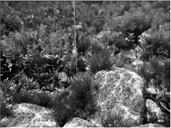 図20Bは、投石地の水深が深い側で、物理的攪乱と生物的な攪乱が少なかったため、クロメの密生群落が成立して1年生のアカモクは生育できない。これは、水深が深い方では、石が大きすぎ、反転や漂砂などの物理的攪乱を受けにくいことが原因である。