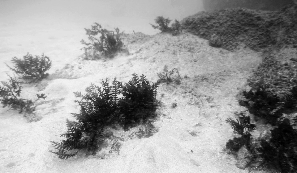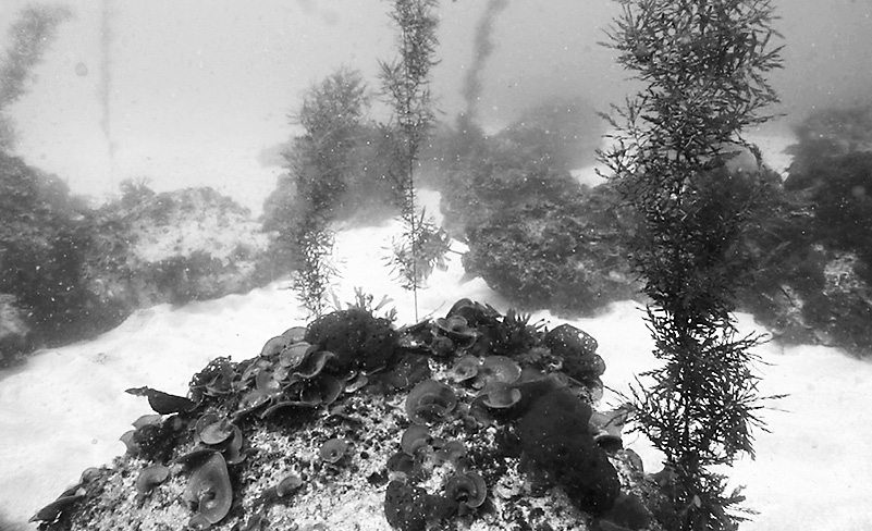 離島沿岸は、林床の腐葉土起源の養分が地下海水とともに湧き出し、養分に富む深層海水の湧昇、高い透明度による豊富な光量により、本来は基礎生産力の高い海域である。黒潮影響下の離島では水温が高く藻食動物の過剰採食により、海草藻類の現存量の低い磯焼けの海底(図1)は、不毛の土地のように思われている。しかし、海藻が育つのに十分な養分と光があり、見方を変えればそこは藻食動物に耕された畑である。これを応用すれば藻食動物を活用した海底の畑化は可能だと考えている。