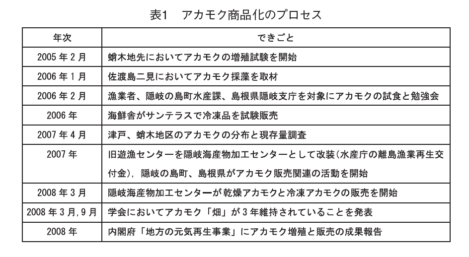 商品化が短期間でできたのは、隠岐ではアカモクが未利用資源であったこと、蛸木・津戸地区で約100tの多量の資源量があったこと、アカモクの単価が生で2000円/kgと高価だったことによる。今後は、