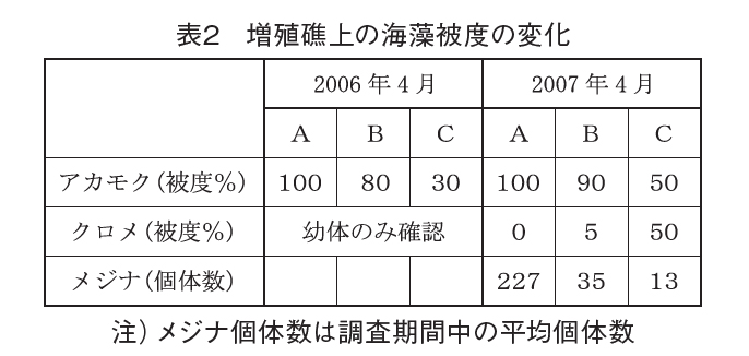 2006年4月には、1年生のアカモクが優占、2007年4月でもほぼ同様であった。一方、多年生のクロメの被度はC区で50%であった。A区では2年続けてアカモクが優占し、C区においては1年目にアカモクが2年目にクロメが優占し、B区は中間で、遷移の進行に違いが認められた。
